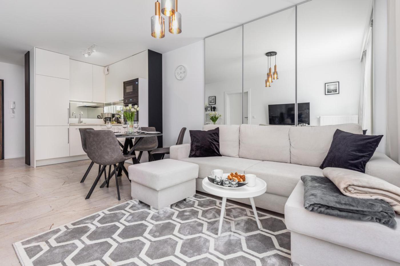 Apartament typu Standard. Featuring a private entrance, this apartment comprises 1 living room, 1 separate bedroom and 1 bathroom with a bath and a hairdryer. Meals can be prepared in the well-fitted kitchenette, which comes with a stovetop, a refrigerator, a dishwasher and kitchenware. This apartment features a washing machine, a tea and coffee maker, a flat-screen TV and a balcony. The unit offers 2 beds. Apartament - 5 osobowy. Powierzchnia pokoju ok.: 43 mkw. ;